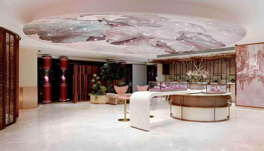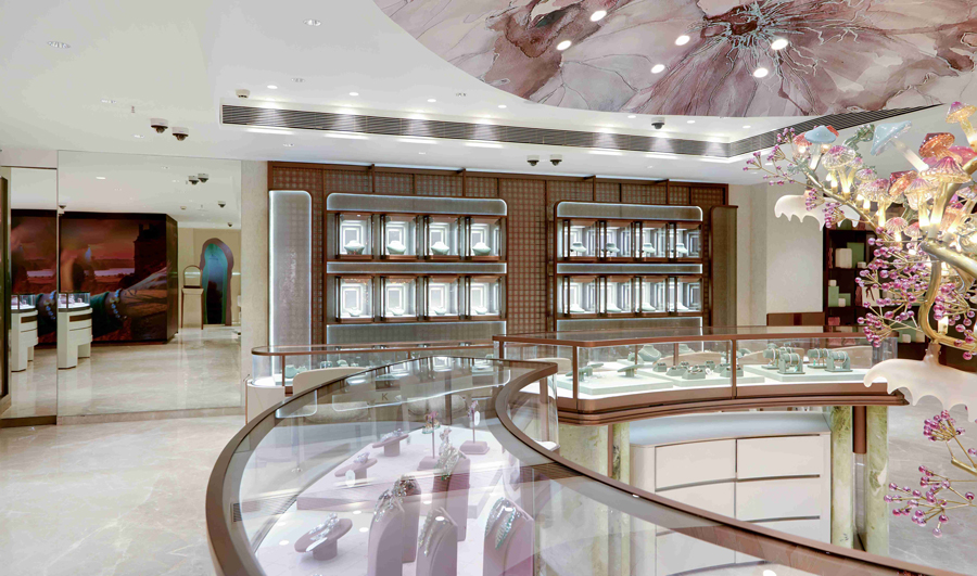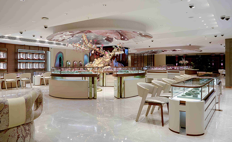 The flagship has been designed for slow discovery, where the layout flows through clearly defined zones, balancing openness with intimacy, and allowing each collection to reveal itself naturally. Bespoke furniture, refined finishes, and select marbles sourced from Italy and Hong Kong are layered with handcrafted details, creating an environment that feels elevated yet warm and welcoming. Technology is integrated quietly throughout the store, from acoustics and security to precision lighting. The façade and showroom come alive through cylindrical 3D LED installations, L-shaped LED screens, and a large-format digital display inspired by Times Square, showcasing diamonds, fashion films, and brand narratives in motion.