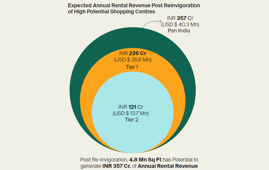 Tier 1 cities offer two-thirds of the immediate potential to generate a rental revenue of INR 236 cr, and Tier 2 cities comprise the remaining one-third with INR 121 cr rental revenue. Reviving distressed centres, often at a lower cost than new builds, can rapidly yield healthy, value-added cash flows.