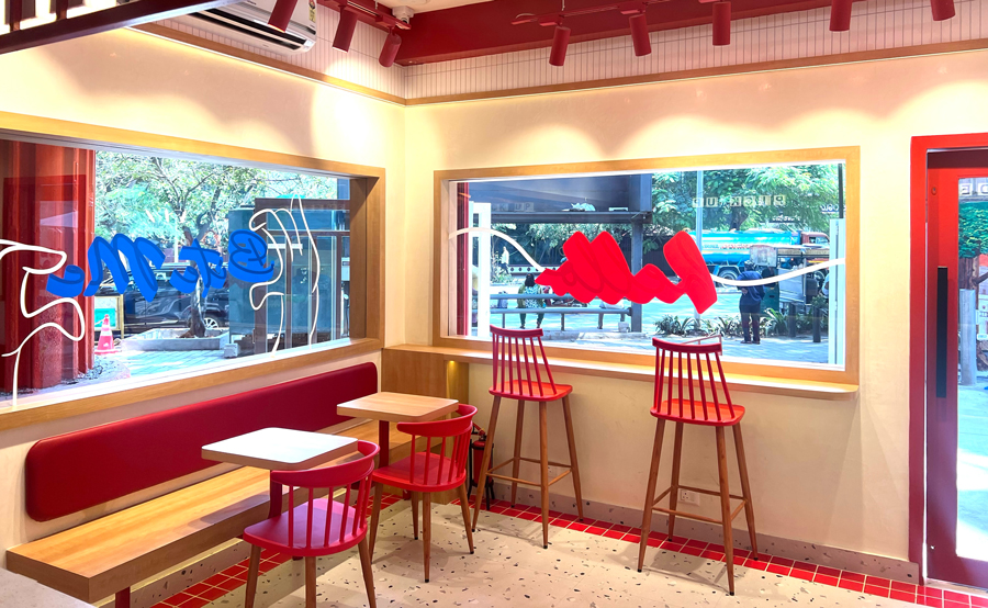 The interiors reflect the brand’s bold, witty personality, drawing inspiration from an 80s diner aesthetic. A striking red cube exterior makes the outlet hard to miss while passing along 100 Ft Road.