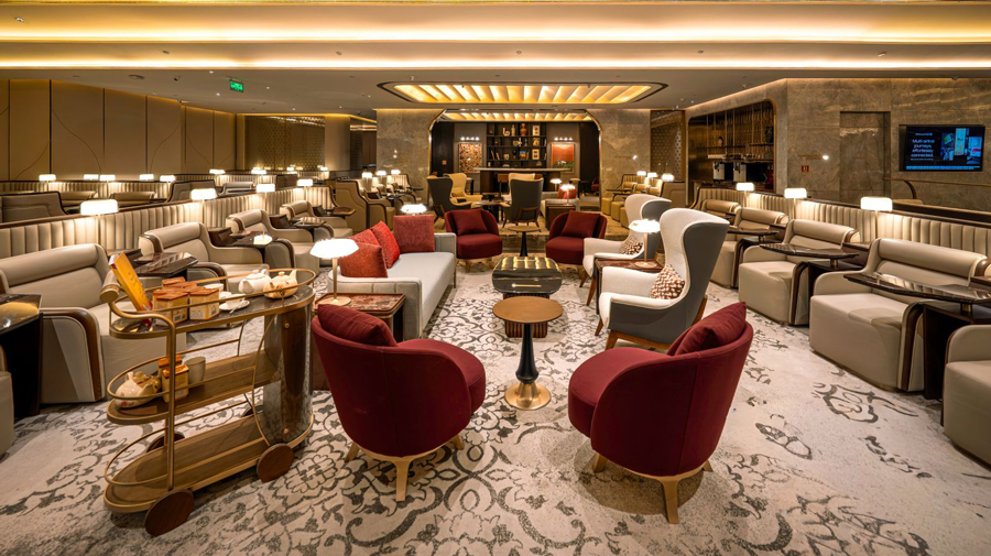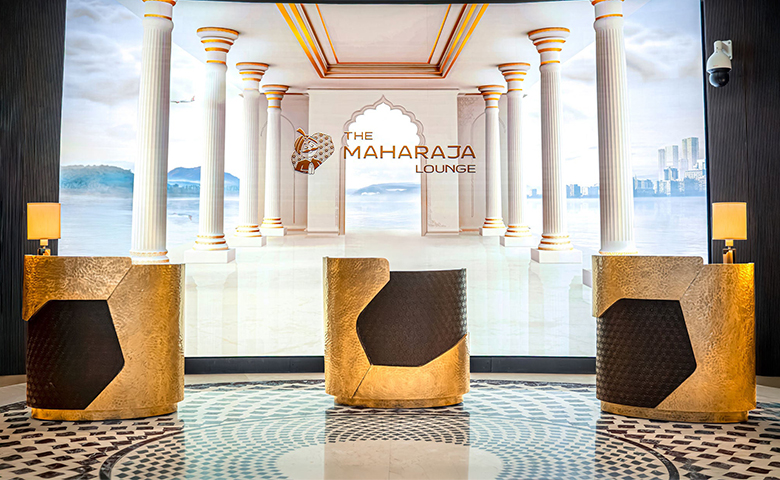 The Maharaja Lounge features distinct zones tailored to different needs, offering serene spaces for relaxation or work alongside more vibrant areas for social engagement.