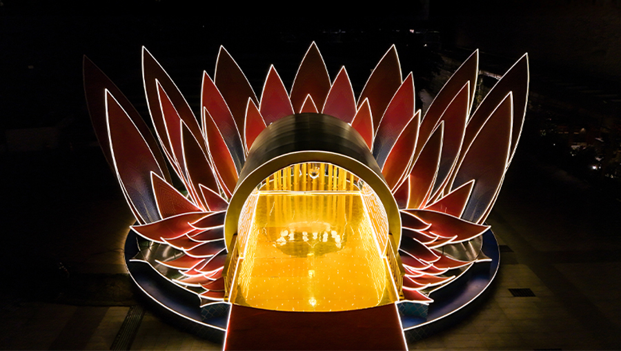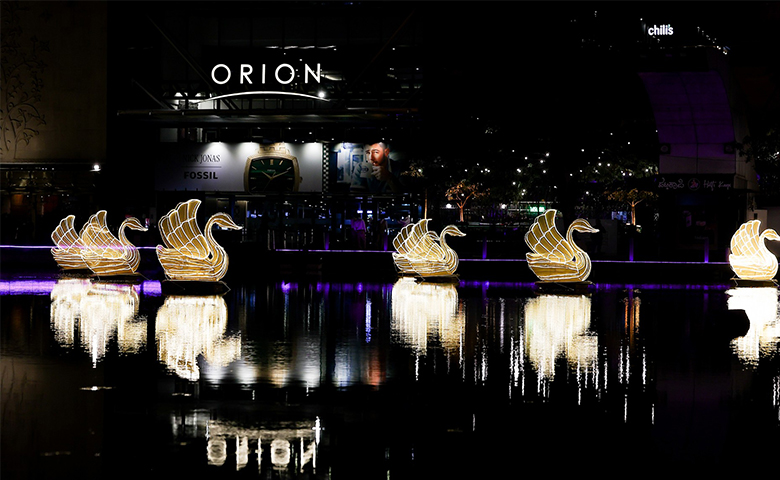 At Orion Mall at Brigade Gateway, the showstopper is a 30-foot lotus. The lotus also features a walkthrough tunnel offering an immersive experience. In order to enhance the festive charm, the area around the lake sparkles with tree lighting and floating swans in the lake, creating a magical Diwali atmosphere.