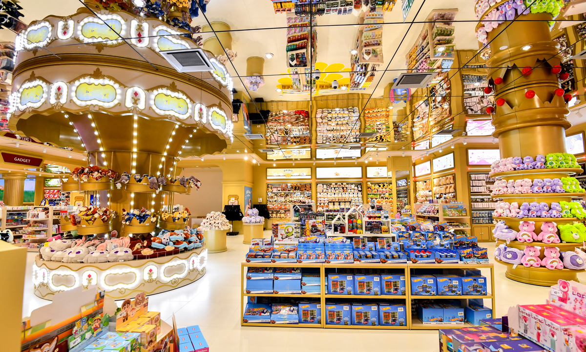The 1,700 sqmt store features 15 themed shopping and interactive zones, with gold-toned interiors and playful bulb-inspired design elements that create a lively and welcoming atmosphere.