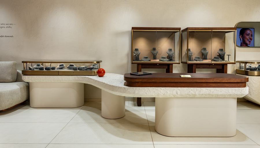 Founded by Rachita Rakyan, the brand celebrates life’s small yet meaningful milestones through thoughtfully designed lab-grown diamonds. To translate that philosophy into space, Nodes of Destiny partnered with Adit Gupta, Co-Founder and Principal Architect of PAV Design Lab. What has emerged is not just a retail outlet but a spatial narrative – bold at the entrance, calm within and carefully layered with symbolism.