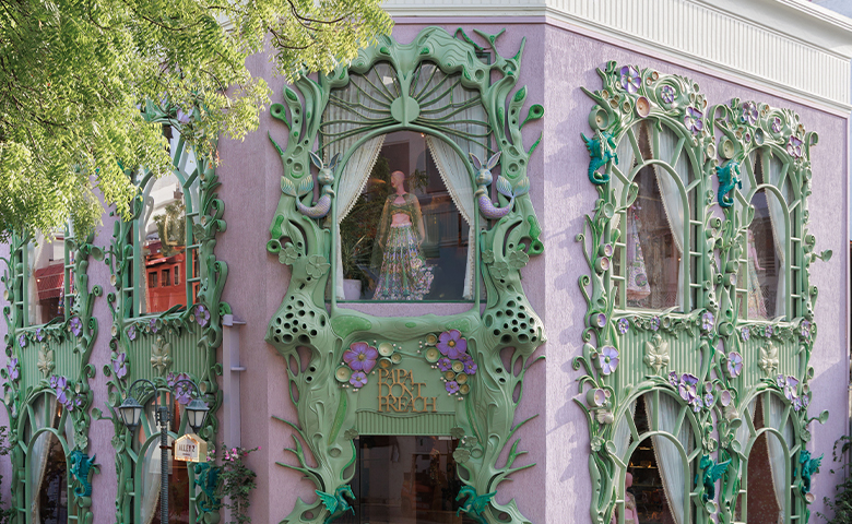 The facade is designed as a siren call, impossible to ignore, deeply layered in meaning. “Afar, it is a spectacle that grabs attention, much like the garments themselves,” says Shimona. “Up close, the craftsmanship tells its own story, reflecting the detailed handiwork Papa Don’t Preach is famous for. Commercially, the facade acts as a guide, turning curiosity into visitors. Conceptually, it shows that the brand doesn’t just occupy a space but shapes it, making the facade a statement of its identity.”