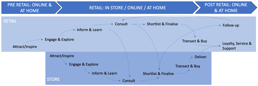 2. Journeys: Once stakeholders are identified, the next step is to define their journeys. These journeys are broken down into four key segments: Onboarding, Experience, Relationship, and Loyalty. These are then mapped across a seamless retail journey, encompassing the Pre-Store, In-Store, and Post-Store stages.