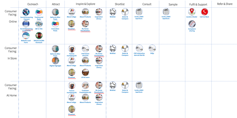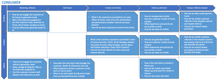 3. Channels: We then define the three key omnichannel touchpoints: At Home, In-Store, and Online. This ensures a comprehensive view of how stakeholders interact with the brand across different environments.