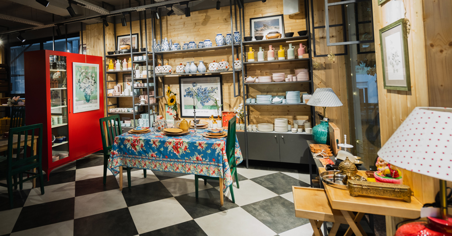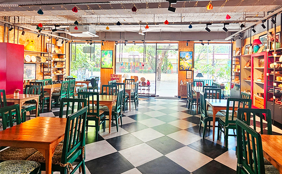 Every piece of furniture follows the golden ratio, which allows flexible seating arrangements for both casual cafe visits and larger events, such as sit-down dinners, workshops, and community gatherings. The cafe also doubles as a product studio, where decor items and serveware are showcased in real-life settings, which creates a seamless blend of retail and experience.
